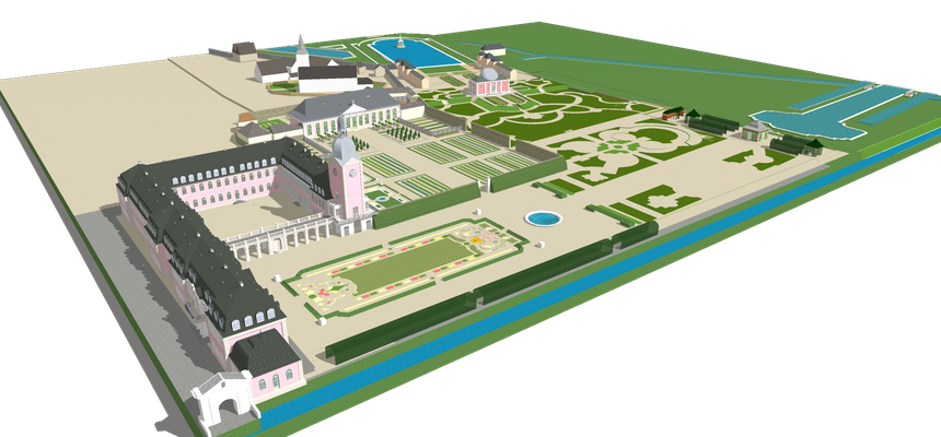 So könnte das Schloss im heutigen Umfeld aussehen. Über die äußere Gestalt des Hauptbaues des Schlosses ist kaum etwas bekannt. Grundlage der Rekonstruktion ist die Abbildung auf einem Stich des Winterbaus und Karl Lochners Dissertation, die seinen Forschungsstand aus 1920er bis 1940er Jahren abbilden.